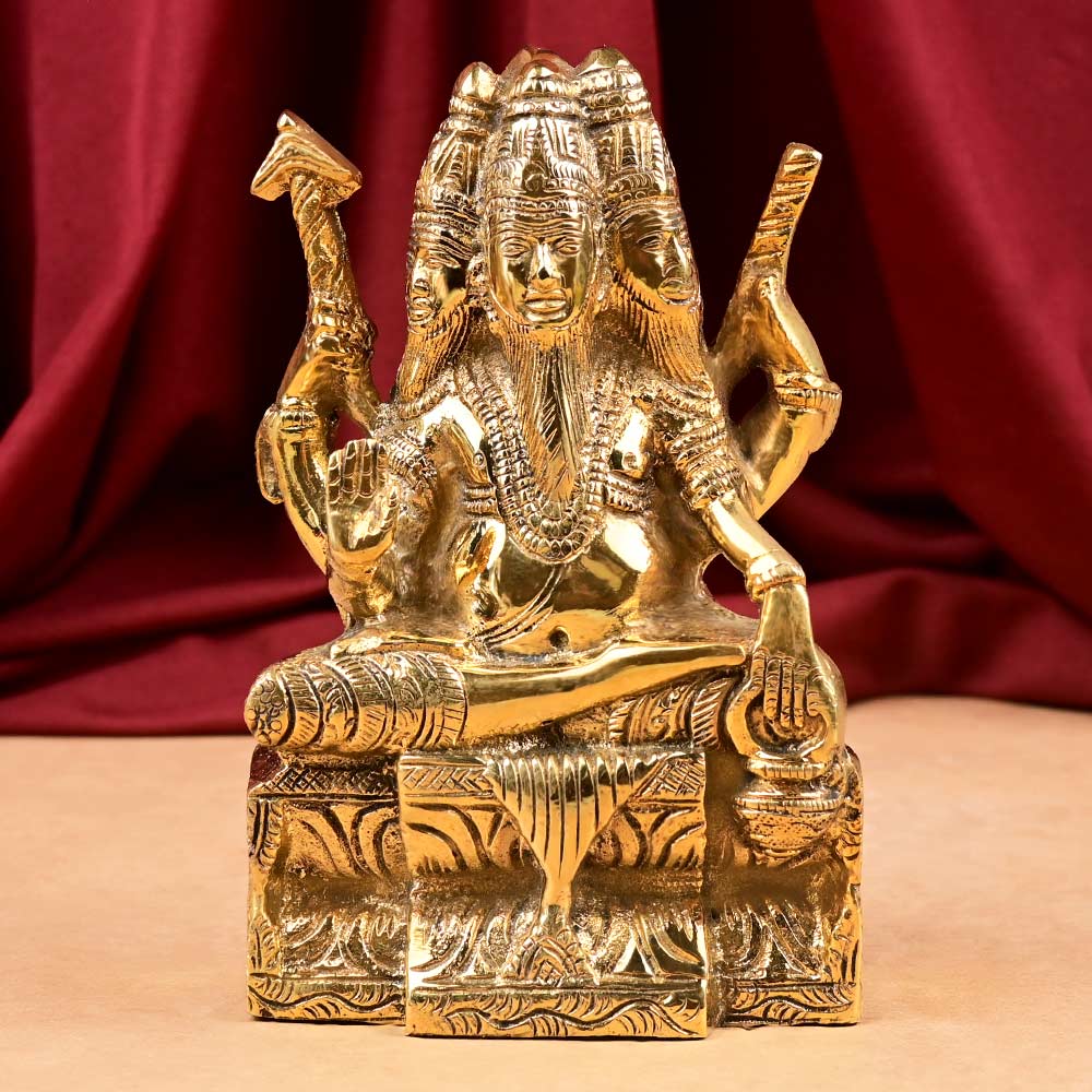 A dignified brass idol of Bhagwan Brahma seated cross-legged on a beautifully designed pedestal, radiating a serene, temple-style presence ideal for puja altars, living rooms, or workspaces. The four faces looking in the four directions signify ego, self-confidence, mind, and intellect, while the long beard symbolizes experience and wisdom, an iconography that emphasizes knowledge and creative force. His right hand is raised in blessing; the upper hands hold an arrow and the Vedas, and the lower left hand holds a water pot, reflecting his role as the creator who presides over Brahmaloka and brings forth cosmic creation.