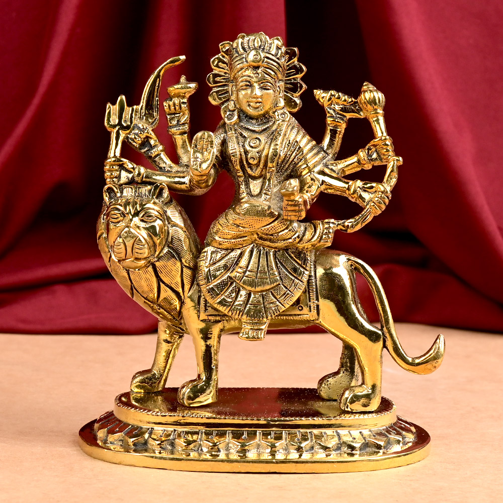 This beautifully crafted brass idol of Maa Durga captures the goddess seated majestically on her lion vehicle, radiating valor, divine power, and assurance. With multiple arms, she wields a collection of sacred weapons bestowed by the gods, Shiva's trident, Vishnu's discus, Indra's thunderbolt, Brahma's kamandalu, and Kubera's Ratnahar, each representing supreme protection and cosmic authority. Rooted in the ancient lore of the Devi Mahatmya from the Markandeya Purana, Maa Durga was manifested as the ultimate warrior goddess to vanquish the demon Mahishasur, who threatened the three realms with chaos and terror.