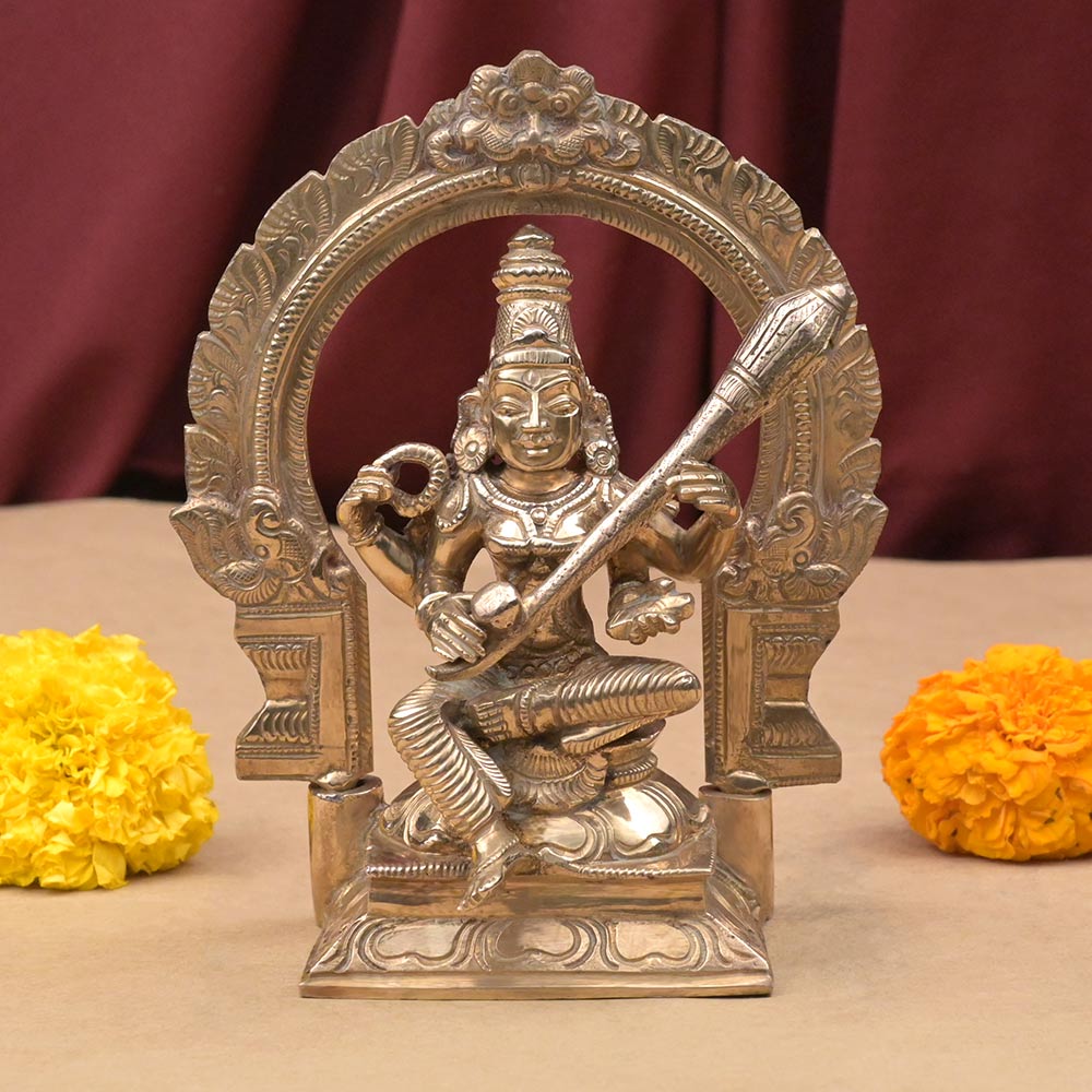 Saraswati is the consort of Lord Brahma and possesses the powers of speech, wisdom and learning. She has four hands representing four aspects of human personality in learning; mind, intellect, alertness and ego. She has sacred scriptures in one hand and a lotus (a symbol of true knowledge) in the second. With her other two hands she plays the music of love and life on the musical instrument Veena.