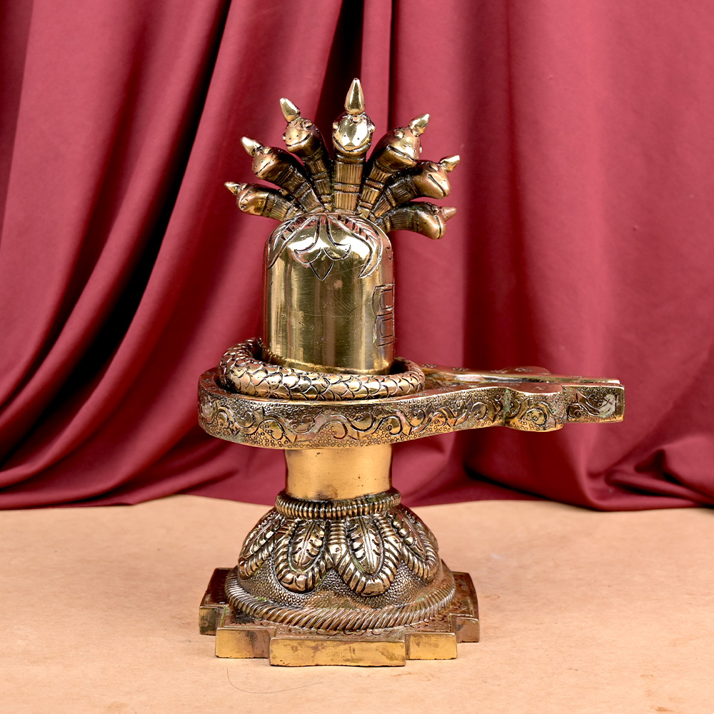 This magnificent Shivling in heavy brass has a 7 headed Snake adorning Him and intricately carved Bel patra and other features on its body.