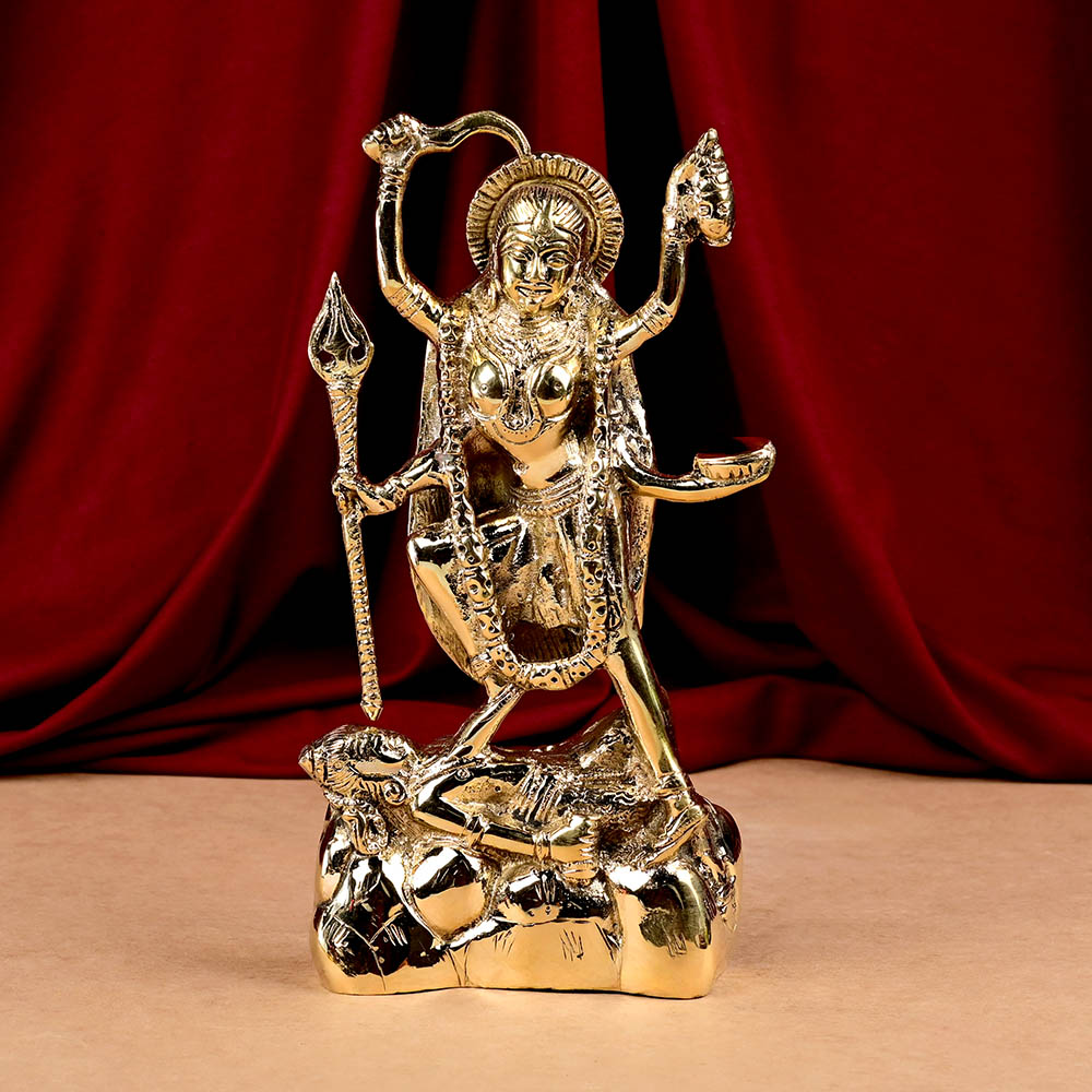 This sacred brass idol depicts Maa Kaali, the fierce yet loving Dark Mother who, despite her formidable form, is cherished for her boundless compassion and powerful protection. Carved from heavy shining brass, the idol captures her dual nature: as the divine force who dispels negativity and as the ever-caring mother who embraces devotees like her own children.