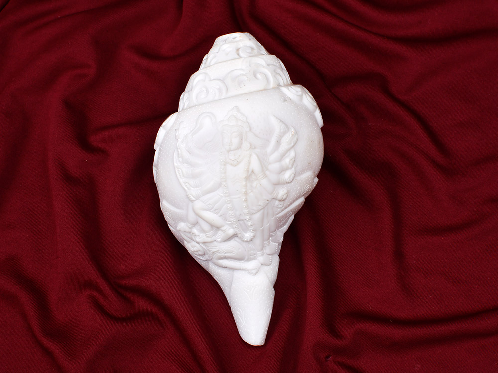 This natural conch shell features an intricately hand-carved depiction of Goddess Mahakaali, showcasing her powerful multi-armed form in dynamic detail. The shankh retains its natural white surface with a smooth finish and a visible texture that enhances its spiritual authenticity. The carving is raised and deeply etched, capturing the fierce yet protective presence of the Divine Mother.