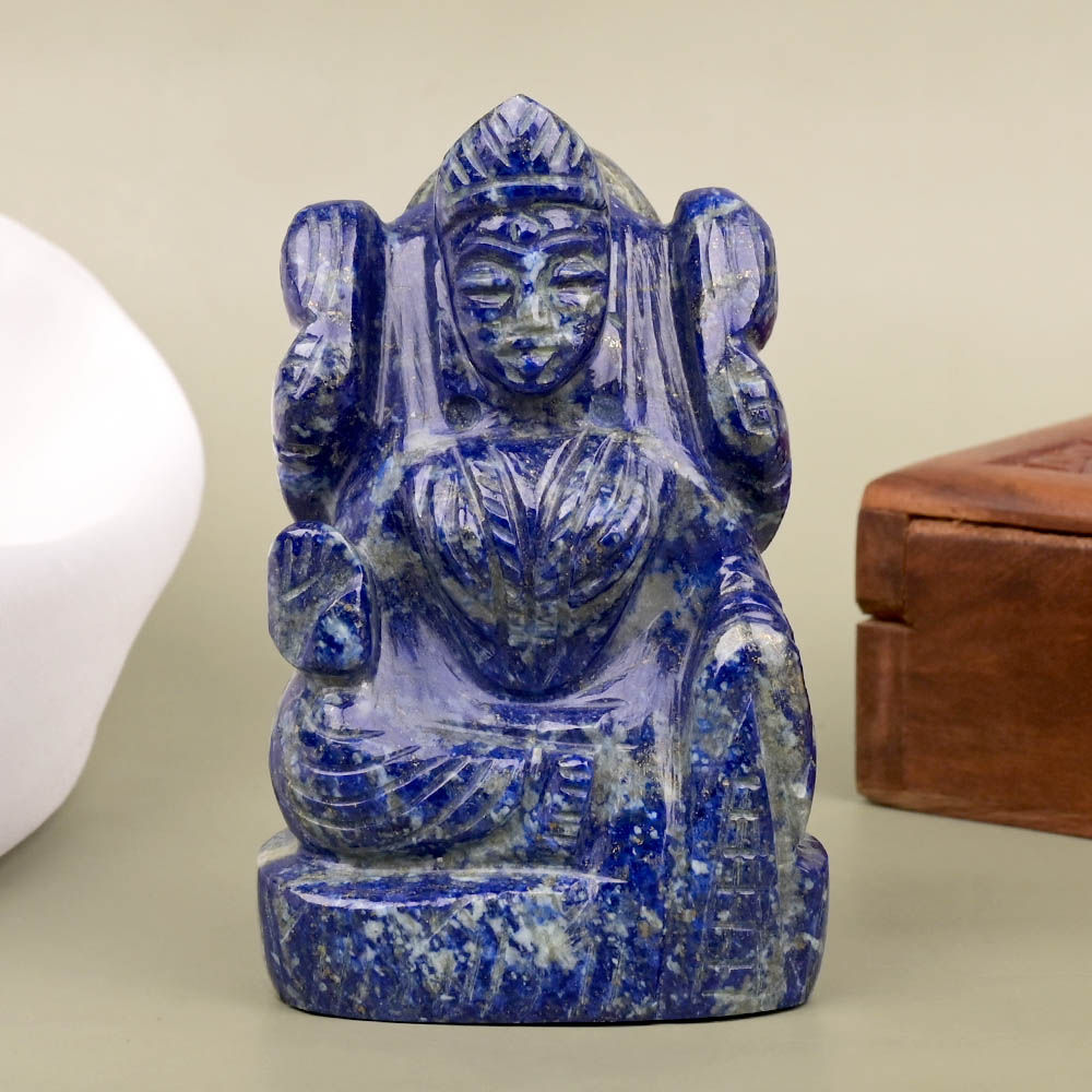 This beautiful idol of Goddess Mahalakshmi is carved in single natural Lapis Lazuli gemstone. This idol features Goddess Lakshmi in a seated position on the lotus. The Goddess is holding lotus flowers in both Her upper hands and Her lower right hand is carved in the blessing pose while Her lower left hand is seen bestowing wealth. This idol is crafted with finesse and can be installed in your house puja alter, in your office or work station. Goddess Mahalakshmi bestows wealth and prosperity and symbolizes good fortune, while Lapis Lazuli is a universal symbol of wisdom and truth.