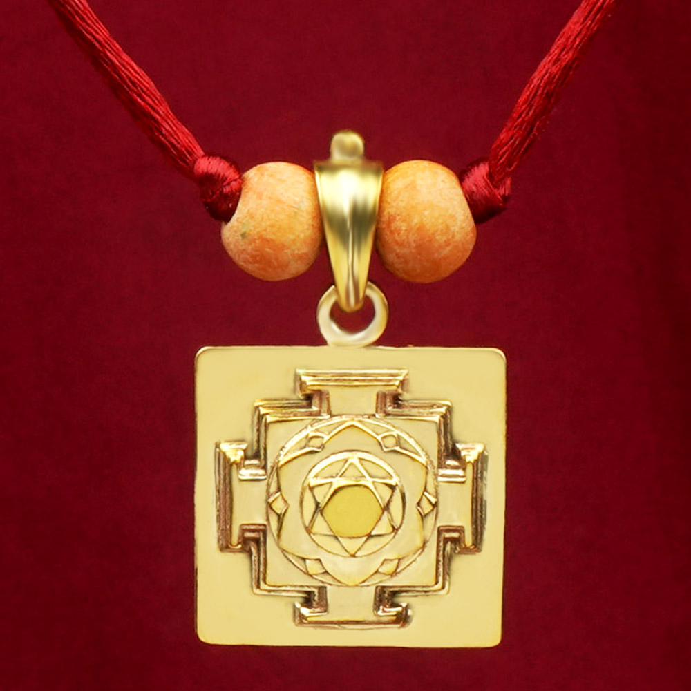 This pendant features a beautifully embossed 3D Mahalaxmi Yantra in gleaming brass, set on a square base with delicately carved lotus petals and sacred geometric patterns that represent abundance, harmony, and divine grace. The yantra is suspended on a red silk adjustable thread and accented with two fragrant sandalwood beads. Designed to be worn near the heart, this yantra emits vibrations of prosperity, beauty, and spiritual wealth, invoking the blessings of Goddess Mahalaxmi for material and inner fulfillment.