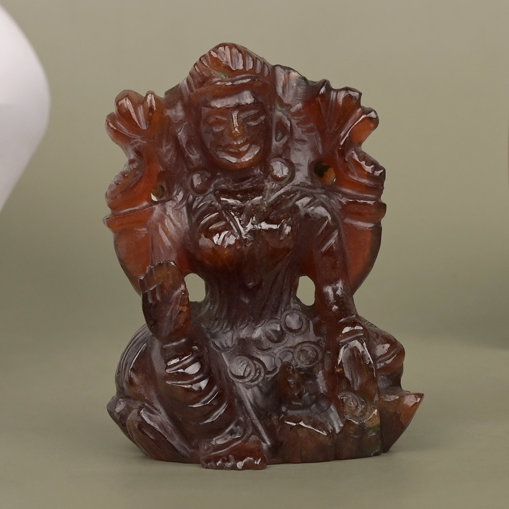 Divine idol of Goddess Laxmi seated on lotus is carved in 100% natural Gomed gemstone. Maa Laxmi is seen raising Her right hand in blessing pose and holding Lotuses in Her upper arms. Her left palm is facing downward with coins flowing from it, signifying total prosperity. Goddess Laxmi is worshipped for blessings of abundance, harmony, positivity, riches and prosperity. This divine idol is ideal to be placed in your puja altar, work or study desk. It also makes a great thoughtful gift for your loved ones during festive occasions.