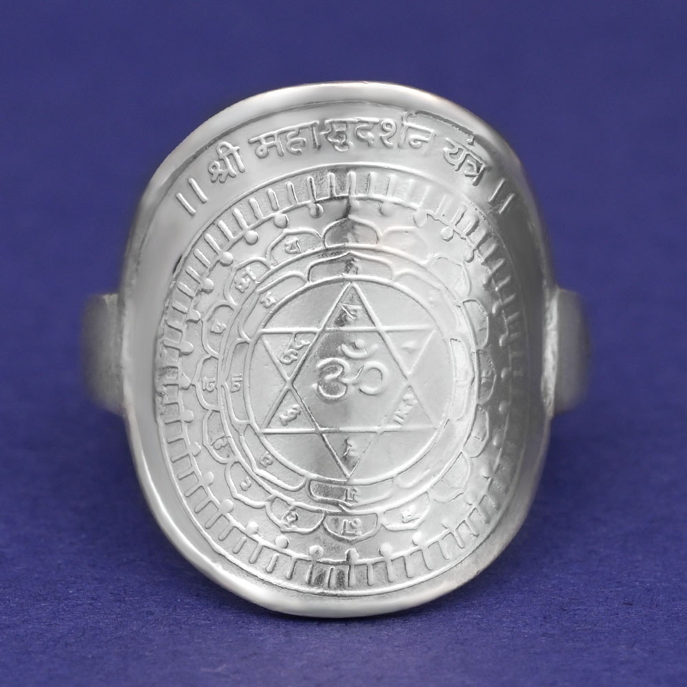Shimmering Mahasudarshan Ring in Silver meticulously crafted in sterling silver, this ring beautifully displays the revered yantra, which is a potent symbol believed to invoke the blessings of Shri Vishnu. This blessed and energized ring has the Mahasudarshan Yantra on top and an image of Bhagavan Vishnu on the inside. This yantra serves as a powerful talisman to attract abundance and success. It bestows harmony, prosperity, and spiritual enlightenment. The ring is believed to balance the body's energies, fostering a feeling of well-being and inner harmony.