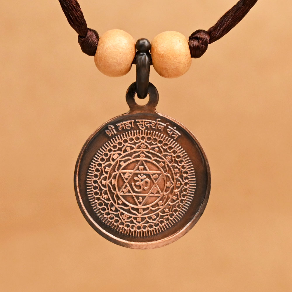 Design This Locket made in antique finish copper has yantra on one side and deity photo on other side. The yantra would be strung in adjustable thread.