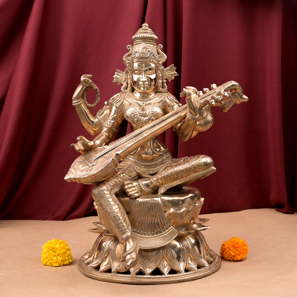 This idol of Goddess of creative arts, knowledge and learning, Maa Saraswati has been finely crafted in bronze. Seated on pedestal in lotus design and holding a rosary and playing the Veena while holding Vedas in Her other hands, the divine idol is an iconic piece of art. Each aspect including the fine drapes of the sari, detailing of jewels and physical attributes crafted in a realistic manner has been brilliantly carved to perfection by the artisan. Reflecting the rich art form of South of India, the majestic idol is ideal to be kept in your living area or educational or art institute. It also makes an ideal gifting idea for a student or artist, keen to learn and grow.