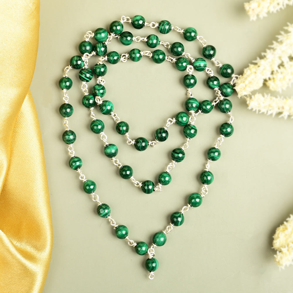 This finely handcrafted Malachite 925 Silver Wire Mala features polished round malachite beads strung individually with delicate 925 silver wire links. The vibrant green beads showcase natural striations unique to malachite, while the silver wire wrapping adds a sleek and structured touch. Lightweight and flexible, this mala can be used for wearing, japa, or energy balancing, making it both functional and visually appealing.