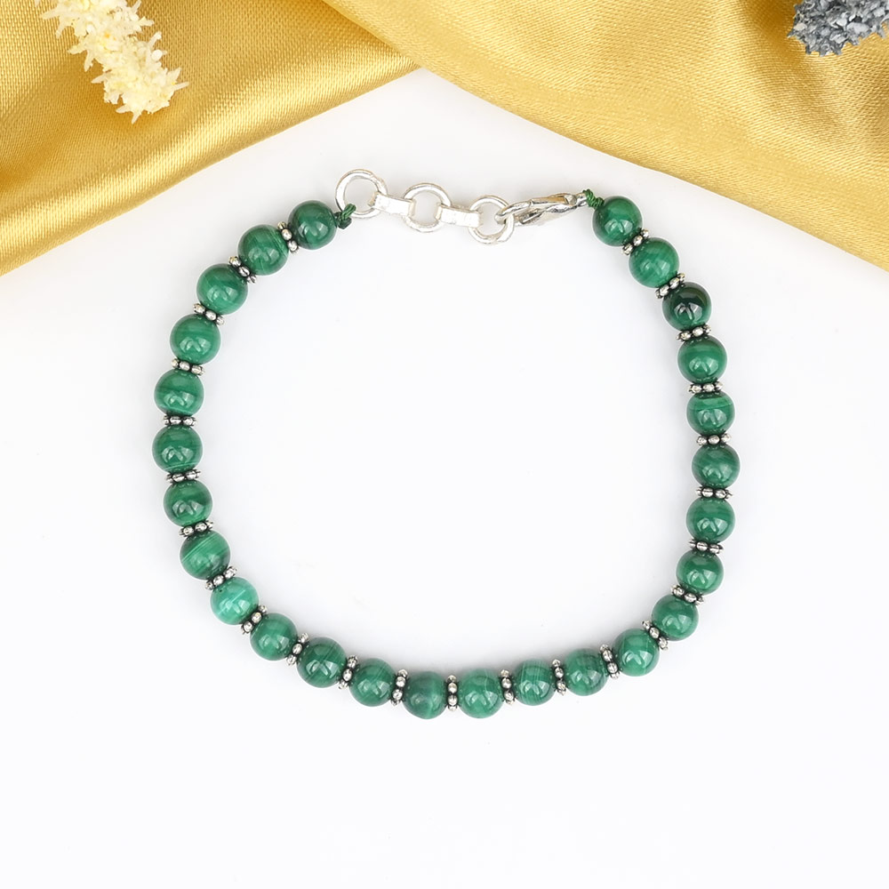 This Malachite Silver Chakri Bracelet features round, polished malachite beads with deep green hues and natural banding patterns, elegantly spaced with intricate german silver chakri spacers. Strung on a durable cord with a lobster clasp closure, it offers a secure and stylish fit. The silver accents add a refined touch, making it a striking blend of beauty and spiritual significance. Benefits of Malachite Emotional Healing & Transformation – Malachite is known as the "Stone of Transformation," helping to release past traumas, emotional blockages, and negative patterns while promoting inner growth and balance. Protection from Negative Energies – This powerful stone absorbs negative energies, shields from electromagnetic radiation, and safeguards against psychic attacks, making it an excellent stone for spiritual protection. Heart Chakra Activation – Malachite resonates with the heart chakra, encouraging love, compassion, and emotional clarity while enhancing relationships and personal growth.