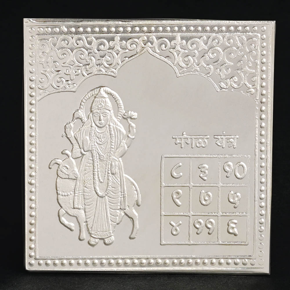 This Yantra in pure silver has embossing of Mangal Yantra and His image with floral inscription at top. The Yantra can be framed or carried in a purse or wallet to imbibe the divine blessings. Mangal governs planet Mars and represents assets, willpower, passion, leadership skills, action, fearlessness, bravery and strength. This Yantra helps pacify the malefic of the planet and radiate its beneficial powers.