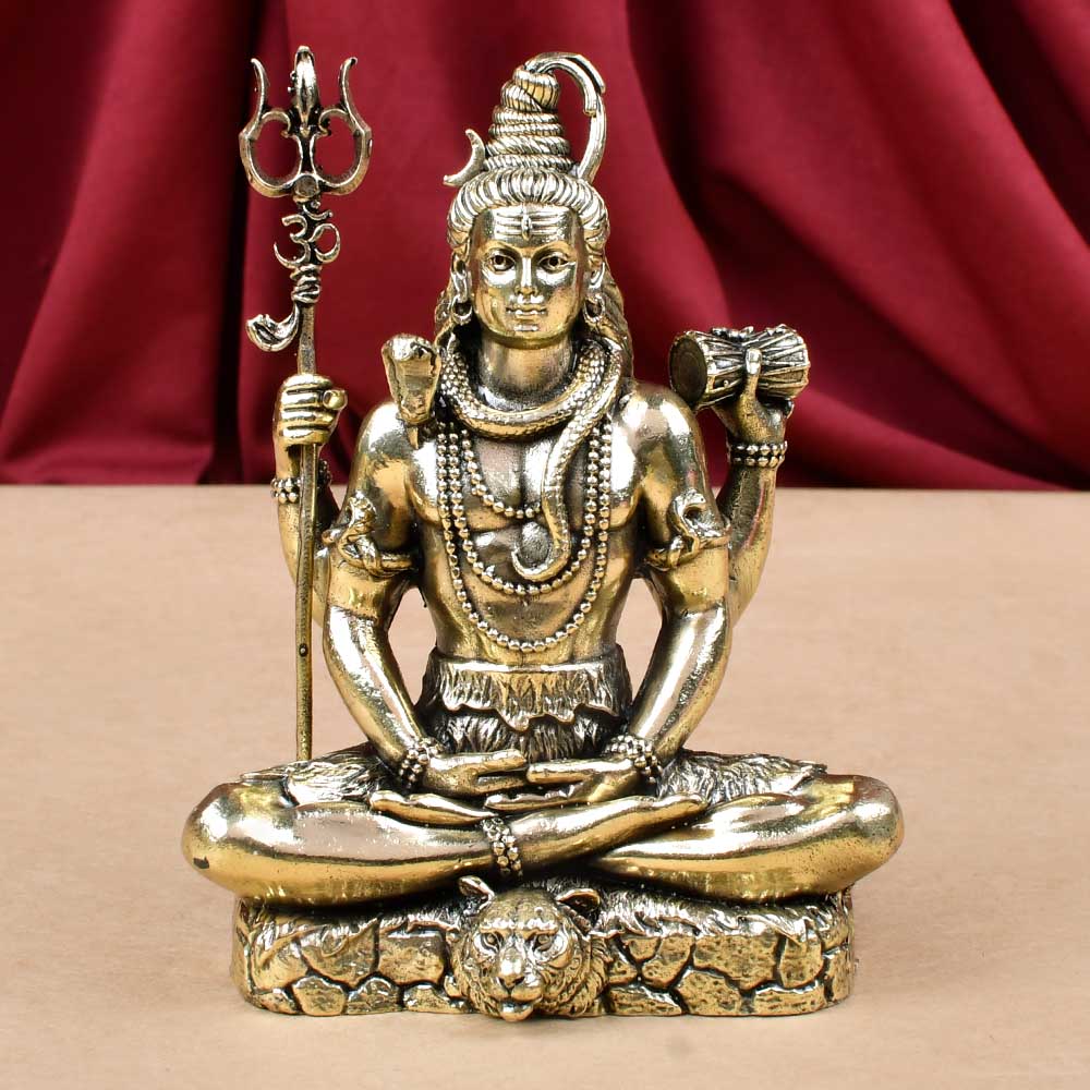 This serene idol captures Lord Shiva in a deep meditative pose seated on a tiger skin with a calm expression, holding a trident (Trishul) and damru in his hands, with serpents and rudraksha adorning his form. Crafted from Ashtadhatu, a sacred blend of eight metals—gold, silver, copper, lead, zinc, tin, iron, and mercury (with gold and silver in trace amounts)—the idol has a rich antique finish and detailed craftsmanship that brings out every divine element.