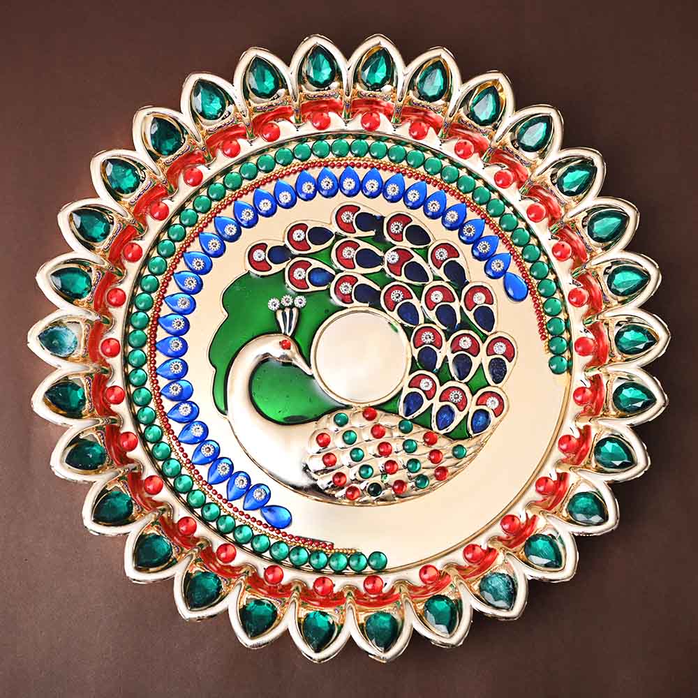 Puja plate to hold offerings to diety during prayers . Meenakari work with a peacock design that gives it an elegant shine. Ideal for your Navaratri prayers. Made in acrylic.