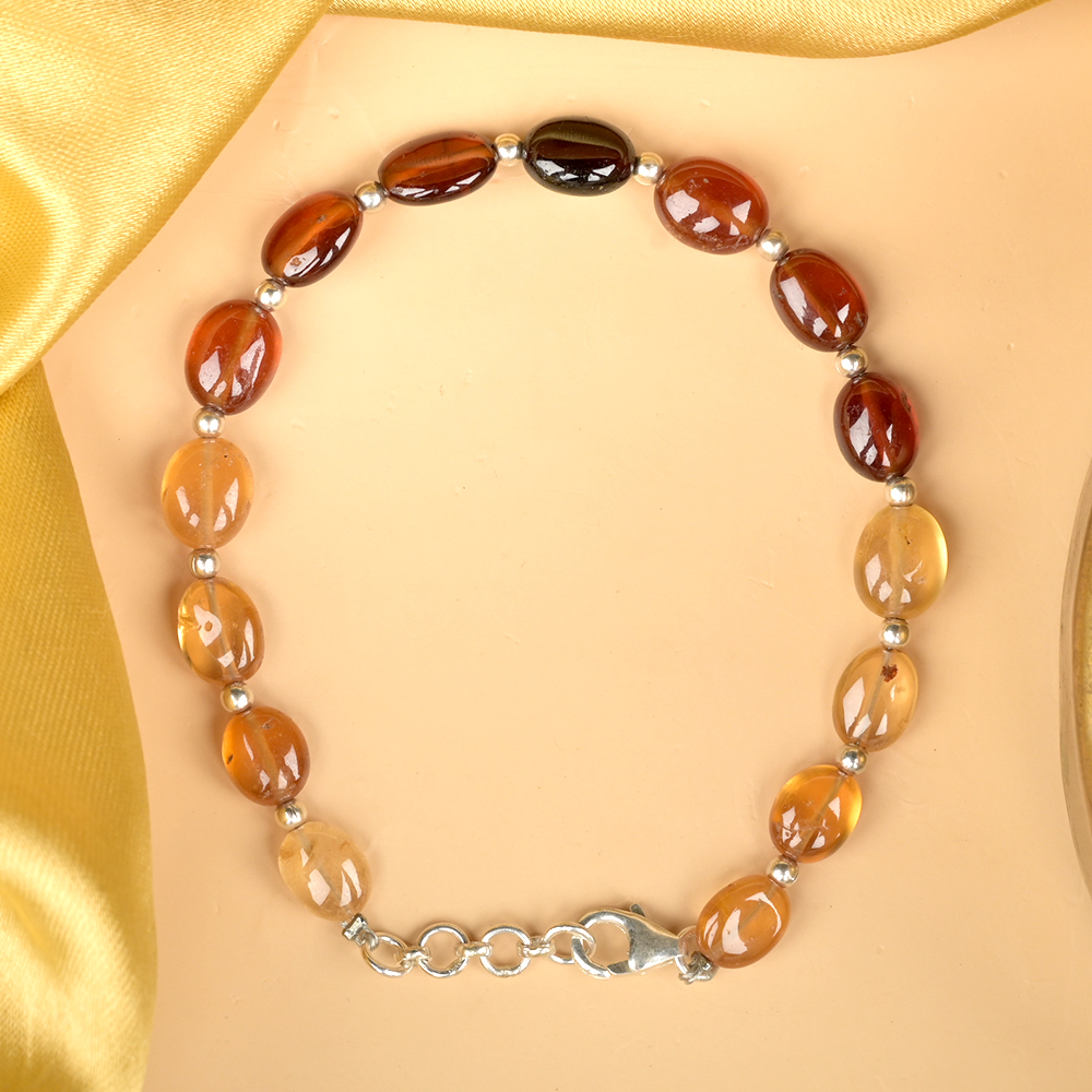 This Multi-Color Gomed Flat Oval 925 Silver Balls Bracelet is beautifully handcrafted with smooth, polished flat-oval hessonite beads in a natural gradient of shades-ranging from golden honey and warm amber to deep reddish-brown. Each bead carries a glossy translucence that highlights the stone’s organic beauty. The bracelet is accented with 925 sterling silver balls, adding elegance, shine, and structural balance to the design. Finished with a secure silver clasp, it offers a refined and stylish look suitable for everyday use or special occasions.