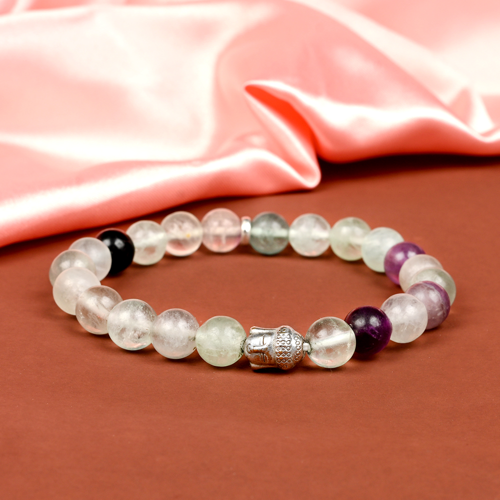 This Multi Fluorite Buddha Charm Bracelet is a harmonious blend of elegance and spiritual energy, crafted with natural multi-coloured Fluorite beads that display soothing shades of green, purple, and clear tones. Each bead is polished to perfection, giving the bracelet a calming and refined look. At its centre rests a beautifully detailed Buddha charm, symbolizing wisdom, serenity, and enlightenment, making this bracelet not just an accessory but a source of mindful energy. Fluorite is known as a stone of clarity, focus, and protection. It helps in clearing mental fog, stabilizing emotions, and enhancing concentration, making it ideal for meditation and spiritual practices. The calming energy of Fluorite is believed to absorb negative energies and harmonize the aura, creating balance and peace within. With the addition of the Buddha charm, the bracelet becomes a reminder of mindfulness, inner strength, and spiritual growth. Perfect for everyday wear, meditation, or as a thoughtful gift, this bracelet balances style with holistic benefits, supporting both spiritual and emotional well-being.