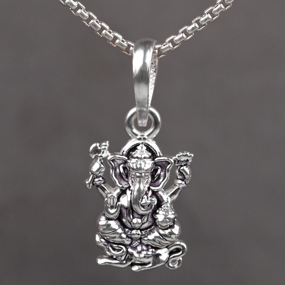 This pendant features Bhagwan Ganesh seated with his vehicle, Mushak (mouse), crafted in 925 sterling silver. The design shows Lord Ganesha with detailed ornaments and symbolic attributes in his hands, along with the mouse at the base. The fine carving highlights his divine form and calm expression. It comes with a sturdy silver loop to pair with a chain or thread.
