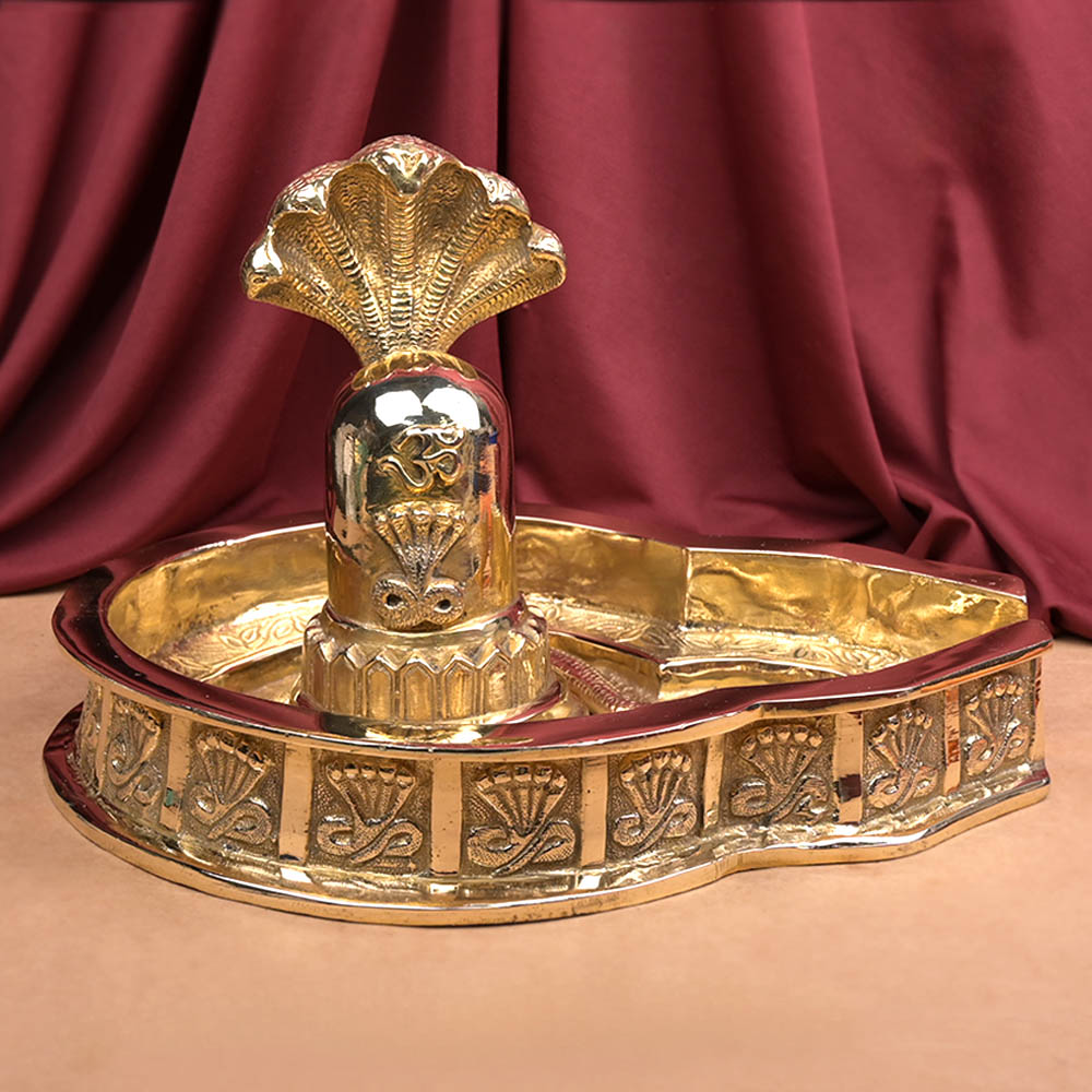 This shivling made in brass features a Lingam with multi-hood Serpent covering it and the Yoni (base) with serpents etched out on its outer border. Having a Shivling at home for daily worship invites Shakti (Intimate energy of Shiva) to take charge of your house in terms driving away the negative forces.