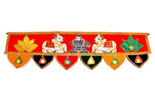 The cloth handmade Toran is made by craftsman from the South of India. This Toran is primarily of Red colour with the patch work of Nandi, the Bull who serves as guard and mount of Lord Shiva and the Divine Shivling as the main theme. The Shivling is in Blue colour cloth patchwork, complete with a Golden garland and Nandi in White colour cloth patchwork on both sides of the Shivling. There is a Green and Yellow colour flower on the left and right of both the Nandi patchworks. There is a border of Golden Zari (lace) on the rectangle cloth, comprising the Shivling and Nandi. Below this are cloth shaped like petals in Black, Yellow, Red colours with tiny patchwork designs on them. The Toran is rustic yet with a good finish.