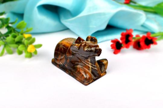 A Nandi idol craved with precision from natural Tiger Eye Gemstone looks attractive. Nandi, the sacred Bull, is Lord Shiva's Vahana(vehicle), His ardent devotee, an integral part of Shiva Parivar and in Lord Shiva temples. A Shivling in the Puja Alter at home/office is incomplete without Nandi idol.
