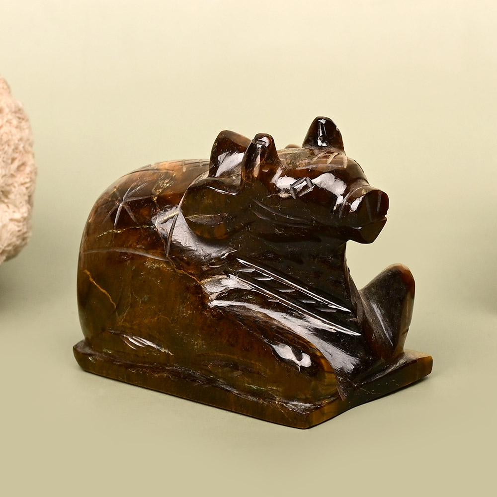 Nandi bull, the Vahana or mount of Shiva is meticulously crafted in natural Tiger eye gemstone. In this eloquently shining idol, Nandi is featured in sitting position with tail tucked in as a matter of submission and humility and the face and feet in repose except one leg signifying waiting with alertness. Nandi is an integral part of Shiva parivar (family) and is seen watching over Shivaling at the entrance of Shiva temple. Nandi is believed to easily transport one's prayers to Lord Shiva. Nandi in tiger eye gemstone brings luck, stability, balance, harmony and support. Place the Nandi idol facing the Shivalingam in your puja altar.