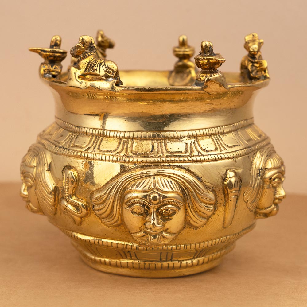 This is a beautiful and artistically carved Kalash with Images of Goddess Kali on the body while Shivling and Nandi idols decorate the mouth. This is carved by traditional artisan in heavy brass with a matte finish.