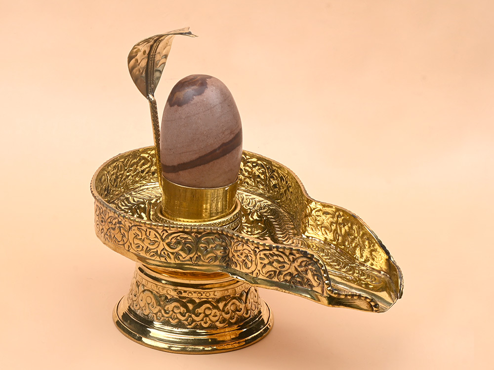 The shivlingam with an intricately designed brass yoni base and a Narmada Lingam adorned with a snake symbolizes the union of Purusha (soul) and Prakriti (material nature). This sacred representation embodies the balance of spiritual and material aspects, reflecting the cosmic harmony and divine interplay between creation and consciousness.
