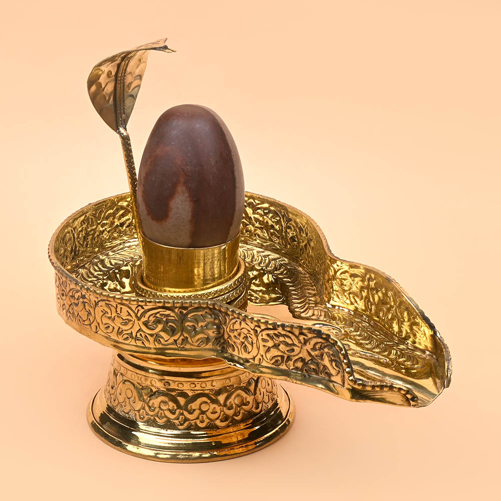 The shivlingam with an intricately designed brass yoni base and a Narmada Lingam adorned with a snake symbolizes the union of Purusha (soul) and Prakriti (material nature). This sacred representation embodies the balance of spiritual and material aspects, reflecting the cosmic harmony and divine interplay between creation and consciousness.