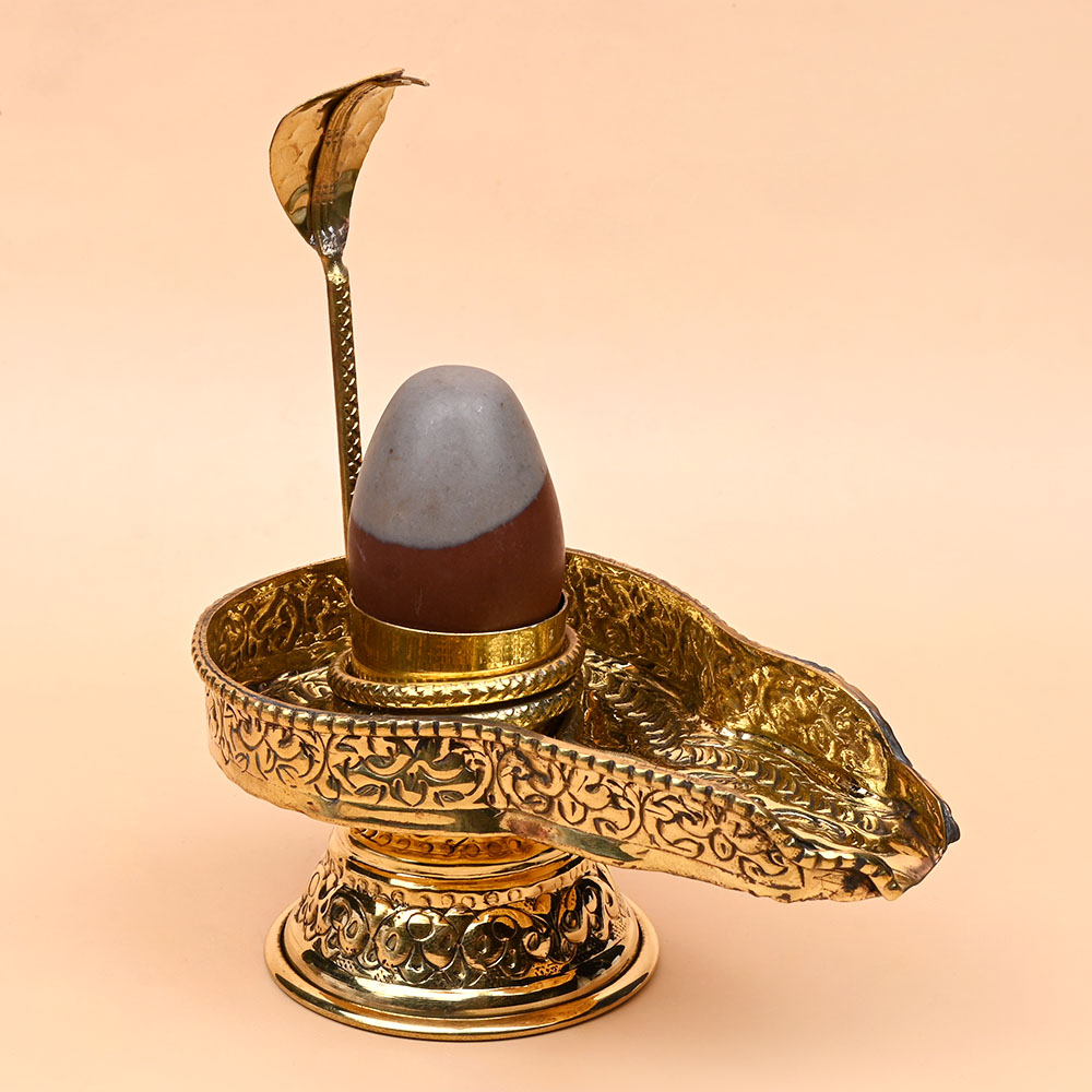 The shivlingam with an intricately designed brass yoni base and a Narmada Lingam adorned with a snake symbolizes the union of Purusha (soul) and Prakriti (material nature). This sacred representation embodies the balance of spiritual and material aspects, reflecting the cosmic harmony and divine interplay between creation and consciousness.