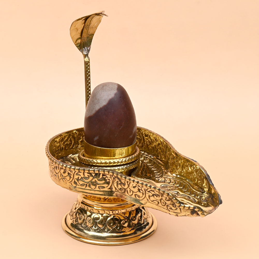 The shivlingam with an intricately designed brass yoni base and a Narmada Lingam adorned with a snake symbolizes the union of Purusha (soul) and Prakriti (material nature). This sacred representation embodies the balance of spiritual and material aspects, reflecting the cosmic harmony and divine interplay between creation and consciousness.