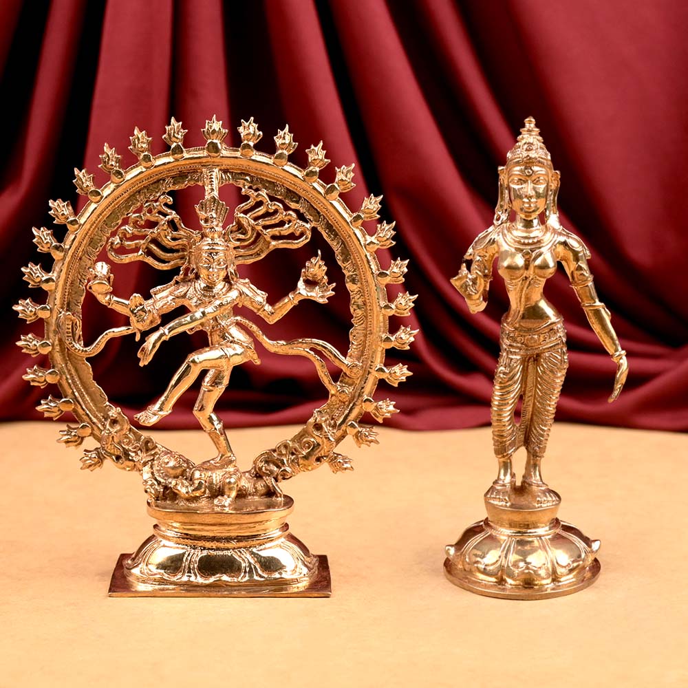 The auspicious set of Lord Natraja and his consort Goddess Shivagami are beautifully crafted from high quality bronze by craftsmen by Kumbakonam in Tamil Nadu. The deities are seen to be standing on a pedestal with hands positioned in the blessing pose. The brilliantly crafted idol illustrates the finer detailing of ornaments and clothing, thereby giving them an enticing appeal. These idols together signify unity, compassion, harmony and prosperity. When placed in your home or office, it invites success, bliss and wholeness. The idols are made by lost wax process, also called cire perdue, a method of metal casting in which a molten metal is poured into a mould that has been created by means of a wax model. Once the mould is made, the wax is melted and drained away.