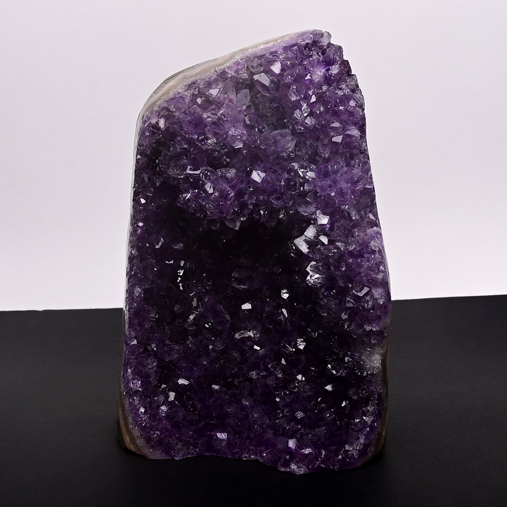 This Natural Amethyst Crystal Geode is a magnificent formation of deep purple crystal points, glistening beautifully against its raw rocky base. The polished cut reveals the inner brilliance of the clustered amethyst crystals, each catching the light to display mesmerizing shades of violet. With its commanding presence and natural elegance, this geode makes for a striking decorative piece, perfect for enhancing the energy of homes, offices, or meditation spaces.