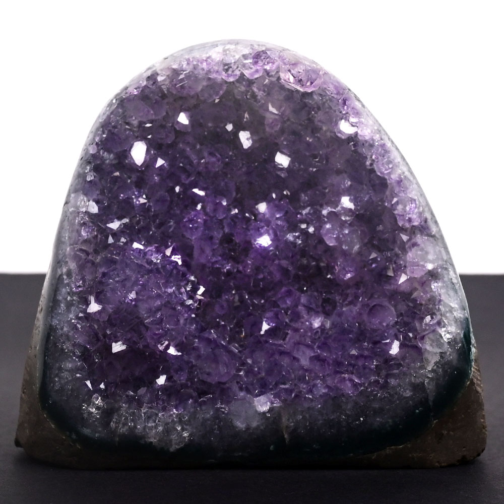 This Amethyst Geode is a naturally formed crystal cluster, displaying stunning shades of deep to light purple with sparkling terminations. The geode is cut open to reveal the inner crystalline world, with its vibrant amethyst points glistening beautifully under light. The contrast of its raw rocky exterior with the radiant, glittering crystals inside makes it both a decorative masterpiece and a powerful energy stone. Perfect as a centrepiece for homes, offices, or meditation spaces, the amethyst geode combines natural elegance with a mystical charm.