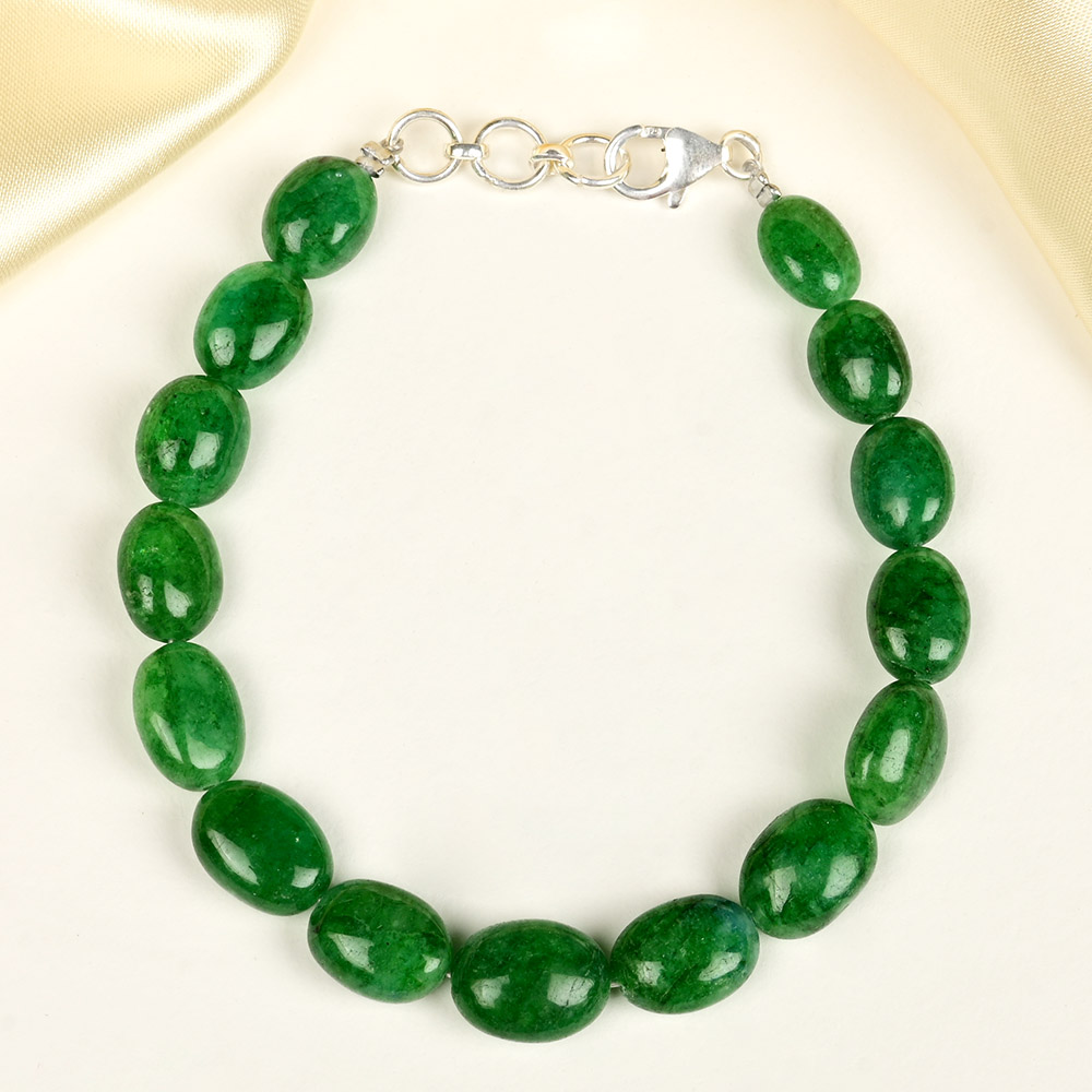 This elegant Natural Emerald Oval Beads Bracelet (96 Carat) is a timeless piece crafted from lustrous natural emeralds, each shaped into smooth, polished oval beads that exude refined beauty. The vibrant green hue of the emeralds radiates a rich, captivating glow, symbolizing renewal, vitality, and prosperity. The beads are carefully strung together on a sturdy wire and finished with a secure 925 silver clasp, ensuring durability and comfort while maintaining a luxurious appearance. Emerald, known as the stone of abundance, love, and insight, is revered for its powerful connection to the heart chakra. Wearing this bracelet helps in opening the heart to compassion, harmony, and emotional balance. It attracts prosperity, enhances intuition, and strengthens mental clarity. Associated with Mercury (Budh Graha), emerald is said to improve communication skills, wisdom, and intellectual growth. This bracelet is ideal for those seeking to enhance self-expression, strengthen relationships, and invite positive transformation into their lives. Whether worn daily or during meditation and spiritual practices, the Natural Emerald Oval Beads Bracelet infuses the wearer’s aura with calmness, abundance, and vibrant energy, making it both a stylish and spiritually empowering accessory.