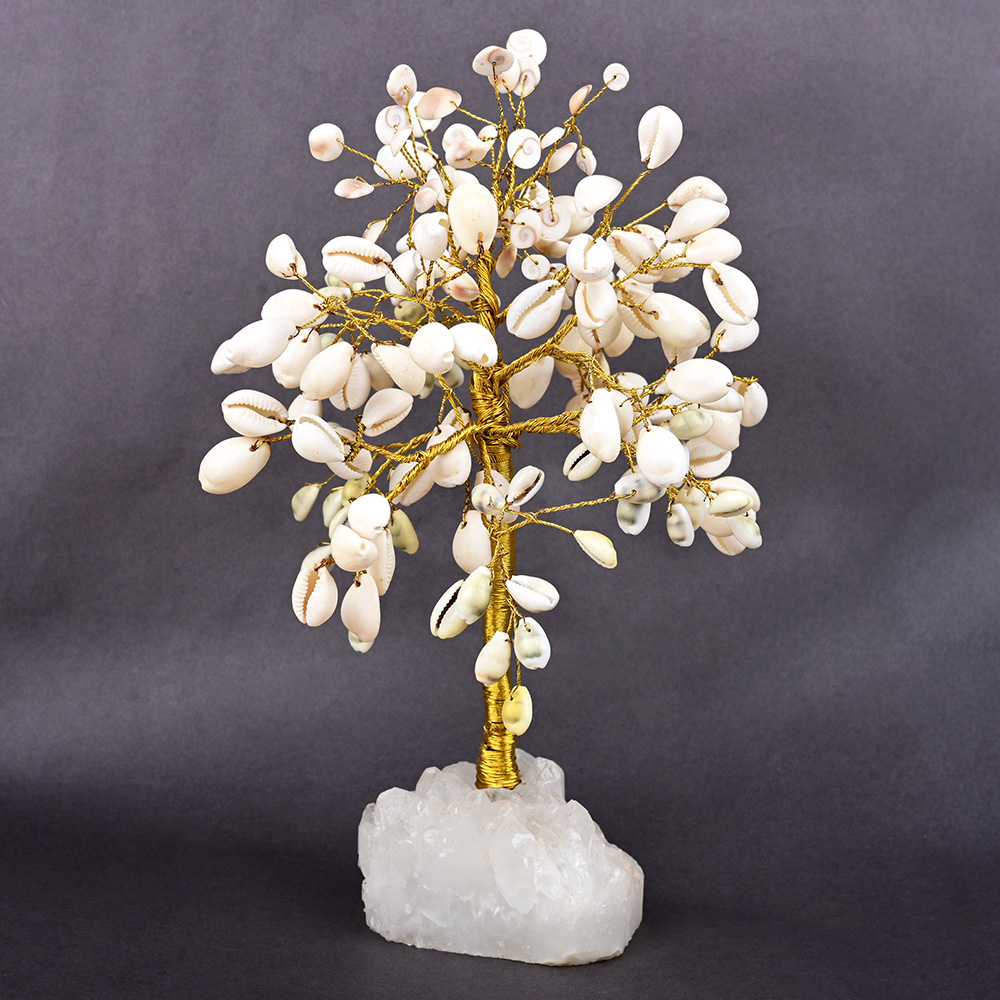 This decorative tree features natural white cowry shells as leaves on golden wire branches, set on a raw white quartz crystal base. The glossy shells shine softly against the gold-toned wires, while the rough quartz adds a grounding contrast. With its full, symmetrical shape and refined craftsmanship, it serves beautifully as both home décor and a spiritual centerpiece.