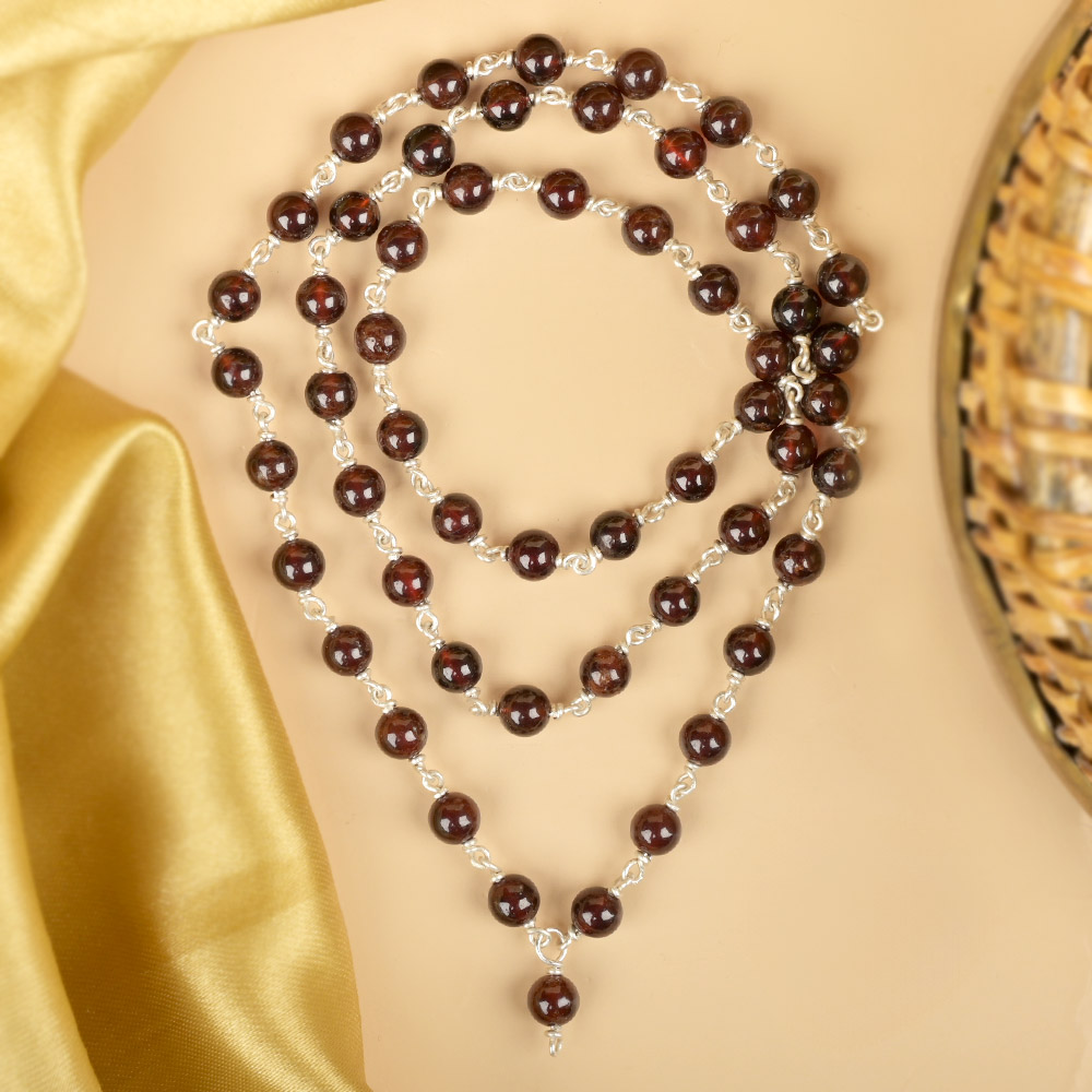 This Natural Gomed 925 Silver Wire Mala features smooth, round hessonite beads in rich honey-brown and deep reddish tones, each displaying a beautiful natural translucence. The beads are securely hand-linked using premium 925 sterling silver wire, giving the mala a refined, elegant structure with a polished finish. Its flowing multi-layer design offers flexibility, durability, and a luxurious appearance, making it suitable for both spiritual use and sophisticated daily wear.