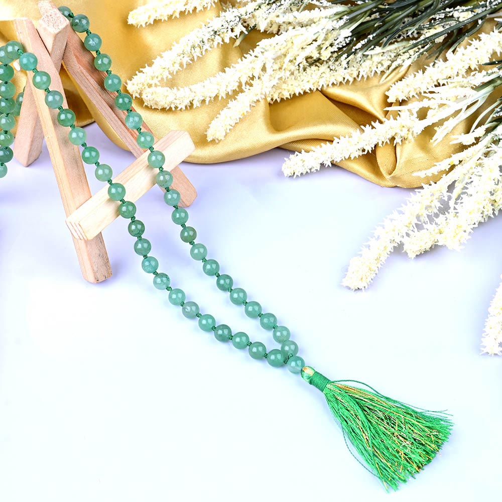 This mala features smooth, polished round beads of uniform size in a rich, translucent green shade. Each bead showcases the natural sheen and calming hue of Green Aventurine. The beads are individually knotted for durability and ease of mantra counting during japa practice. Finished with a soft green tassel that adds a traditional touch and enhances its spiritual appeal. Crafted from natural Green Aventurine, revered as the stone of opportunity, healing, and heart-centred growth. Benefits Brings luck, emotional healing, and clarity of heart in decisions and relationships. Enhances compassion, attracts abundance, and promotes a calm, balanced state of mind.