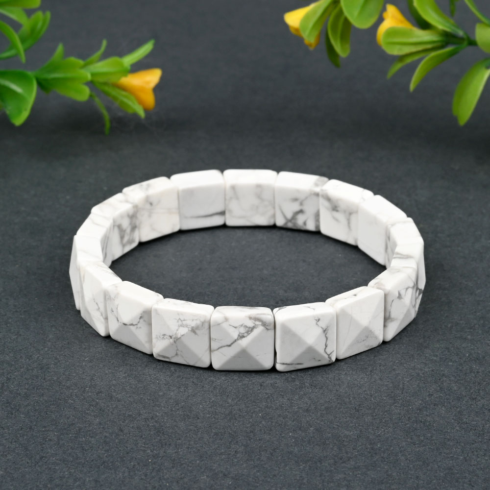 This bracelet is crafted from hsquare-cut Howlite beads with a faceted surface that gives each bead a subtle, reflective shine. The beads display a natural white tone with fine grey veining, adding a calm and sophisticated texture. Each bead is strung on a durable elastic thread for a comfortable stretch fit around the wrist, suitable for both daily wear and meditative use.