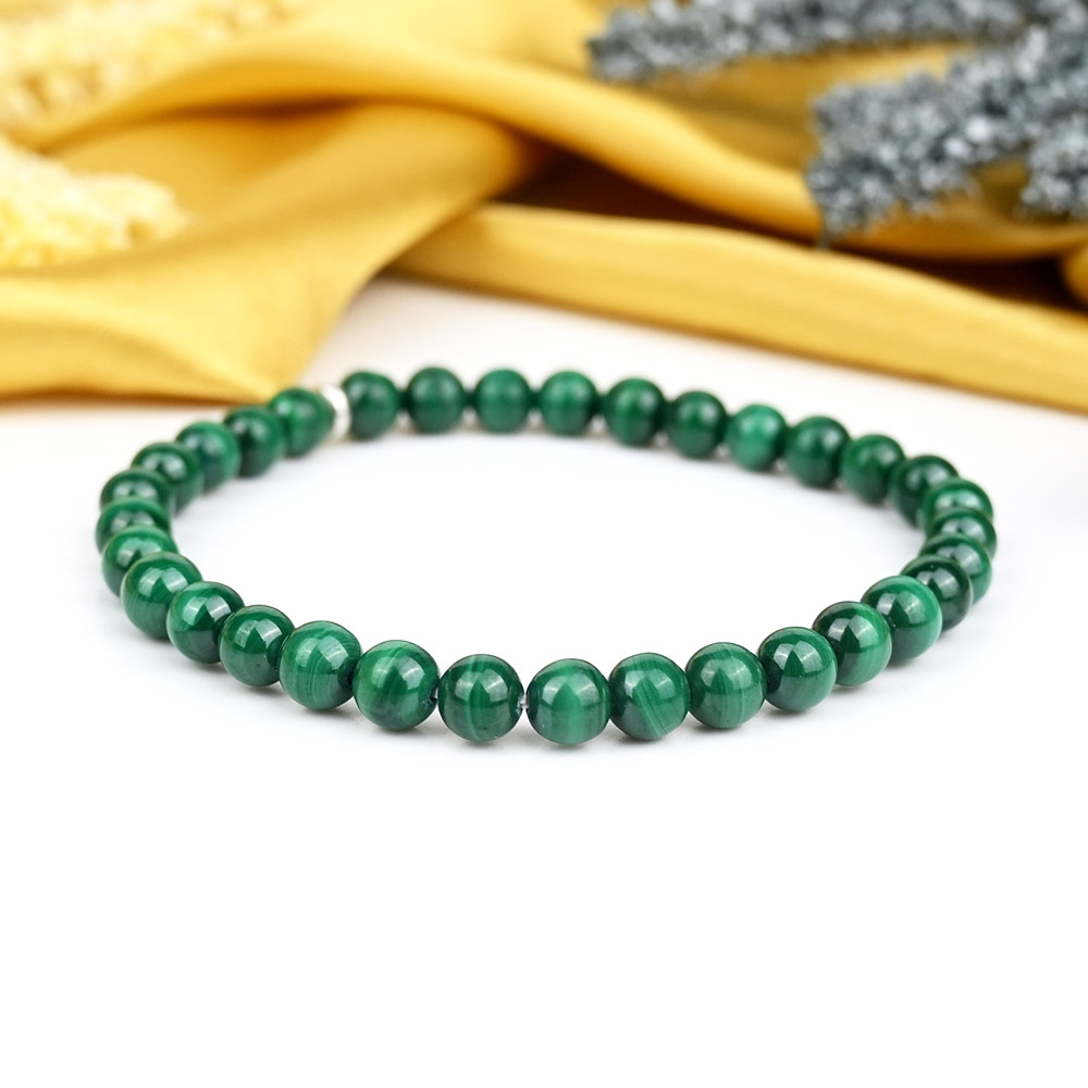 This Natural Malachite Bracelet showcases finely polished, round malachite beads with rich green hues and captivating natural banding. Strung on a durable, stretchable elastic cord, it ensures a comfortable and secure fit for daily wear. The smooth, glossy finish enhances its aesthetic appeal, making it a perfect blend of elegance and spiritual significance. A metal spacer secures the knot, adding a refined touch to the design. Benefits of Malachite Emotional Healing & Transformation – Malachite is known as the "Stone of Transformation," helping to release past traumas, emotional blockages, and negative patterns while promoting inner growth and balance. Protection from Negative Energies – This powerful stone absorbs negative energies, shields from electromagnetic radiation, and safeguards against psychic attacks, making it an excellent stone for spiritual protection. Heart Chakra Activation – Malachite resonates with the heart chakra, encouraging love, compassion, and emotional clarity while enhancing relationships and personal growth.