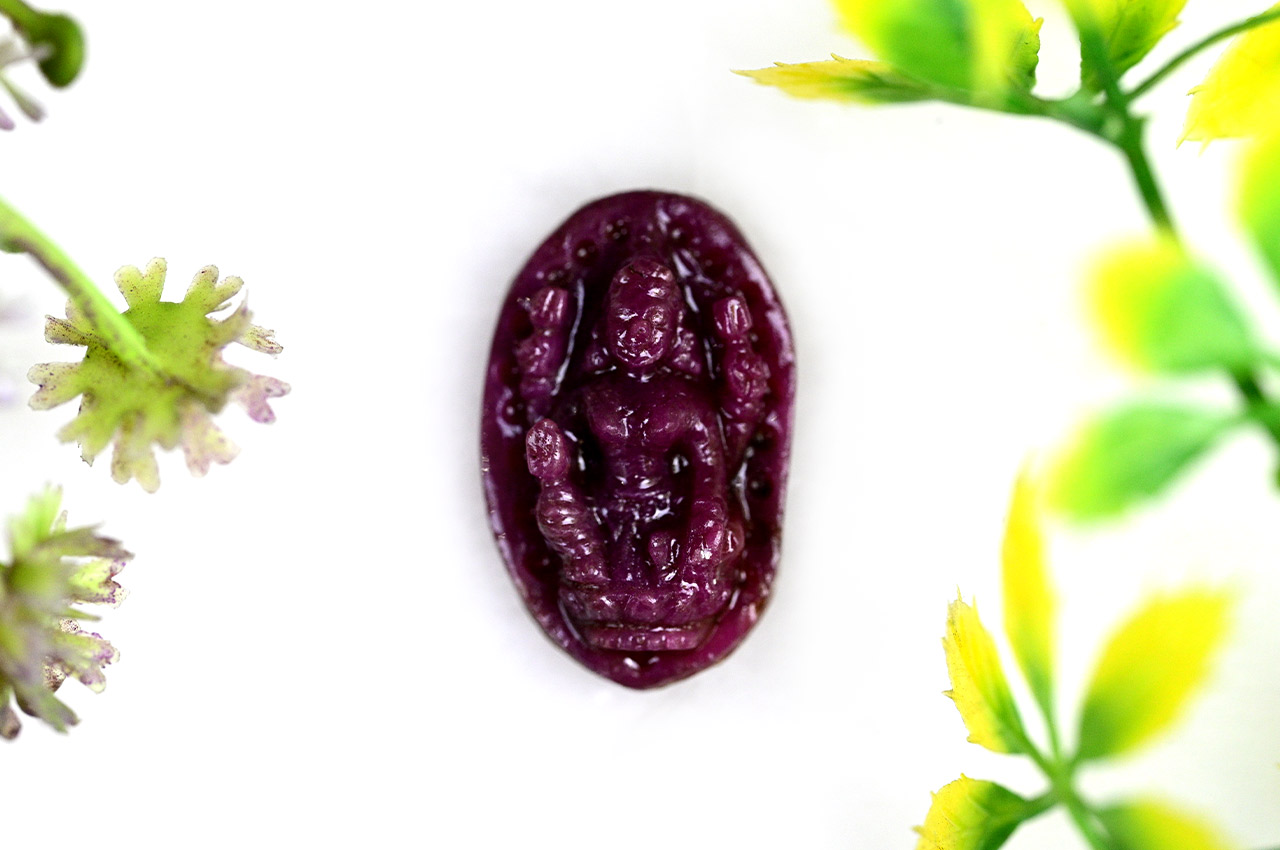 This ideal to make as a pendent or a bracelet for wearing purposes or you may place this in altar. Seated on Lotus, Deities representing purity, abundance and good luck are featured raising their lower right hand in blessing pose in this enchanting sculpture. Ruby is the gemstone of planet Sun which ushers energies of power, name, fame and prosperity.