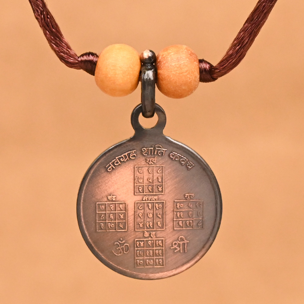 This powerful locket made in antique finish copper has all nine planet Yantras etched on it for blessings of all planets. This locket helps overcome malefic of all 9 planets and brings success.