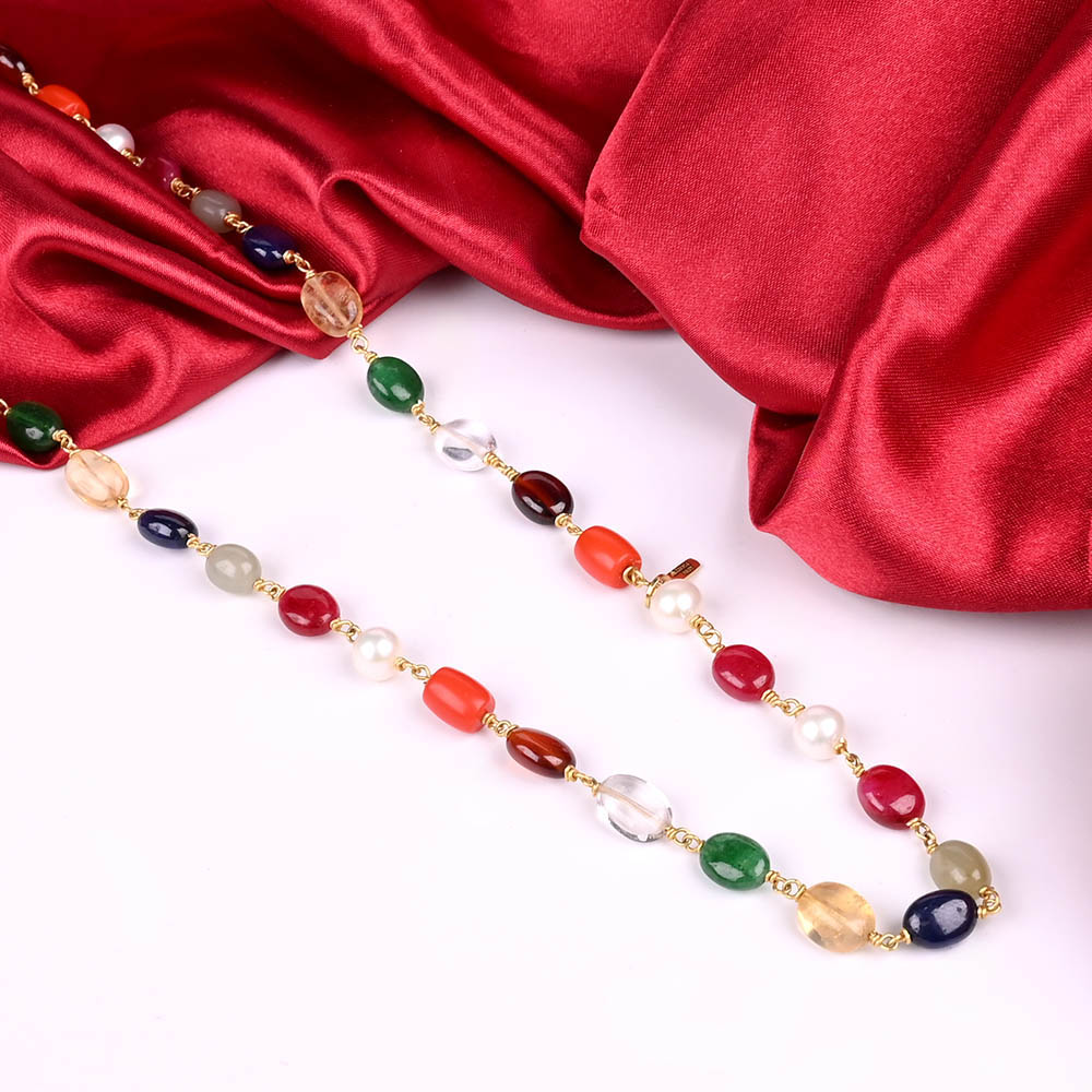 This beautiful Navratna mala is made with best quality round, oval and faceted gemstones- Red Coral, Yellow Citrine, Blue Sapphire, Pearl, Cat's Eye, Gomed, Crystal, Emerald and Ruby.