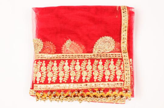 Vibrant Netted red Chunri with fine peacock design embroidery and elaborate golden weaving border. The golden beads strung across the edges add beauty to the chunri.