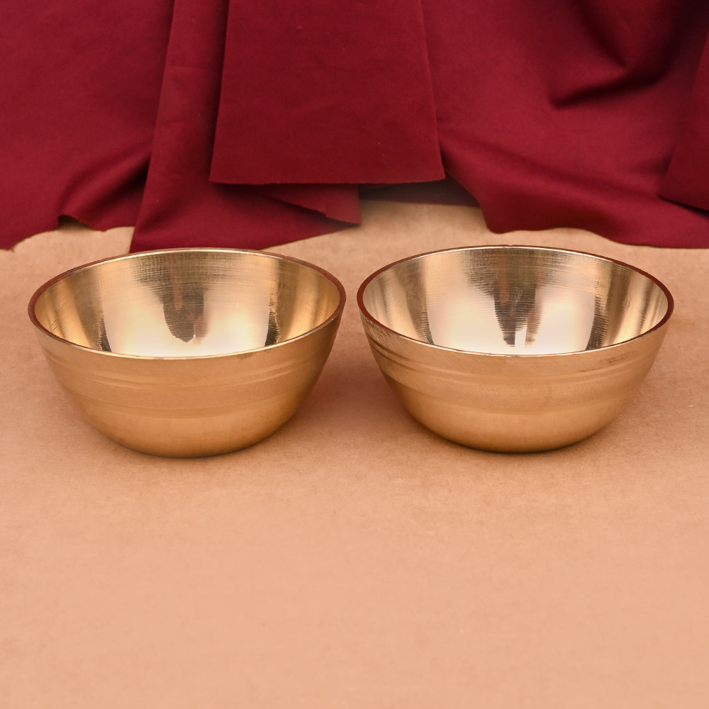 A set of 2 appealing brass offering bowls to hold puja offerings for deity. These bowls can be used for keeping offerings like sandal, vermillion, kumkum, rice or sweets.