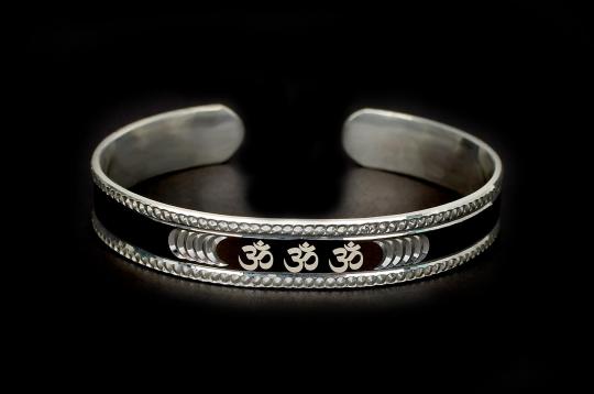 Pure silver Bracelet with mantra "Om" . This beautiful Bracelet in intricate design with high finish would adorn your wrist and be a constant reminder of the Divine within .