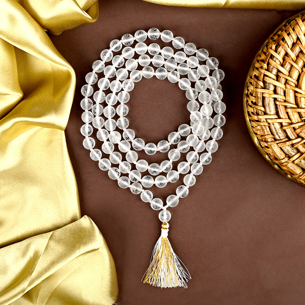 This mala is made from high-quality Sphatik (crystal quartz) beads, each engraved with the sacred OM symbol, representing the primordial sound of the universe. The beads have a smooth, frosted finish, allowing light to pass through them beautifully, while the mala is completed with a white and golden tassel, adding a touch of purity and spiritual elegance. The OM Printed Sphatik Mala is designed for mantra chanting and meditation, with each bead carrying the powerful vibrations of the OM sound. This mala enhances concentration, promotes inner peace, and helps the wearer connect to higher spiritual realms. The OM symbol amplifies the mantra’s energy, making it a potent tool for those seeking to elevate their spiritual practice, purify their mind, and create a tranquil, focused environment for meditation.