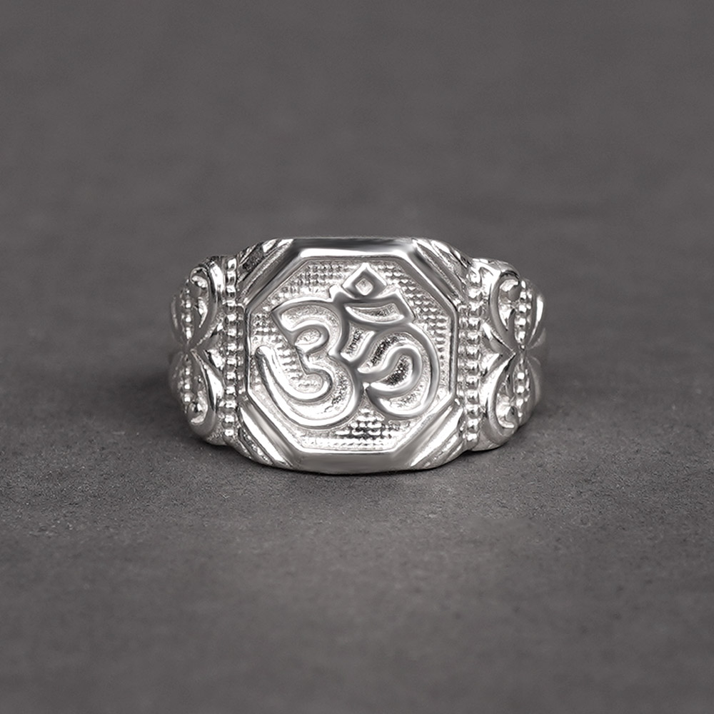 A pure silver ring with neat embossing of the sacred ‘Om’ symbol would make an elegant spiritual jewel. With the floral patterns on sides and broad shape, the ring makes a suitable adornment for men. Smooth finish on inner sides ensures comfort when worn as regular wear jewel. The brilliant shine and matt finish add to the beauty of the ring. The charm of the ring lies in its traditional design, making it a jewel that would go well with ethnic as well as formal wear.