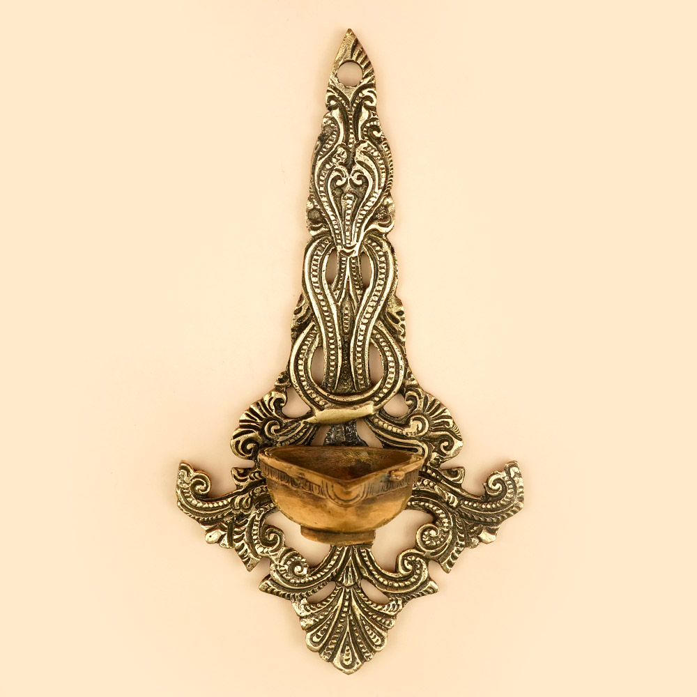 This hanging Aarti Diya is beautifully crafted with intricate floral designs in heavy ornate brass.