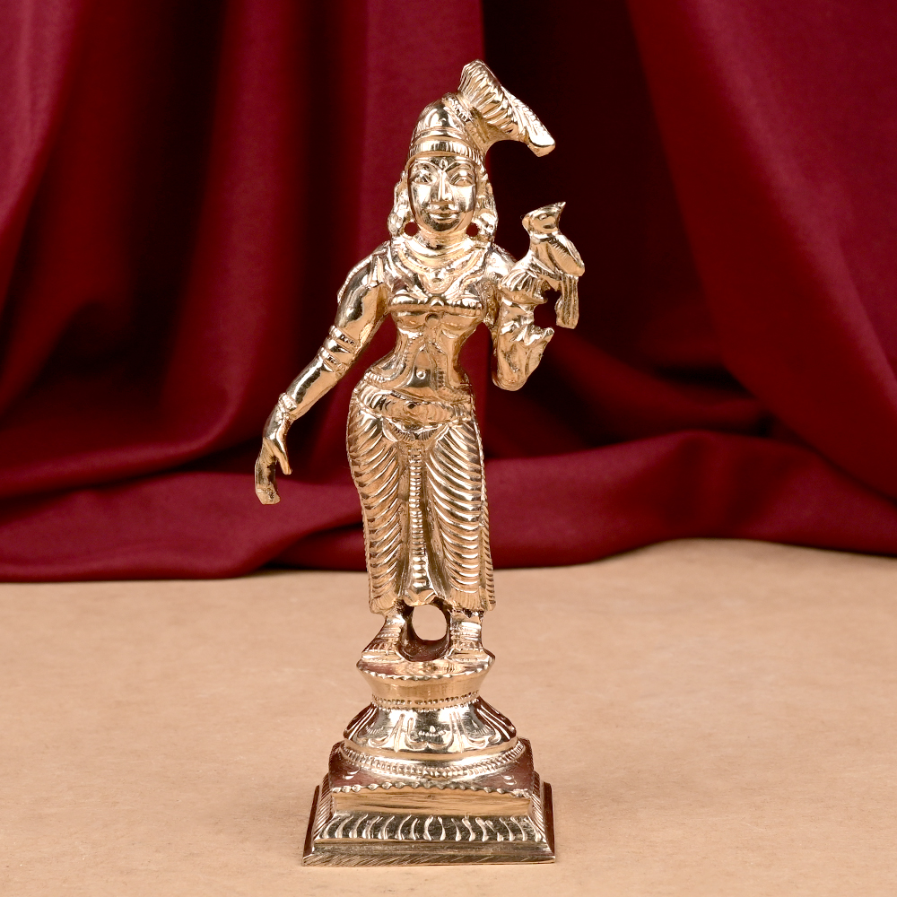 The divine Idol of Padmavati Devi gracefully standing on dais holding parrot in left hand is made from Panchadhatu. Made by traditional artisans from south India the idol brims with beauty and energy.Padmavati devi, consort of Shri Venkateshwara is mother Goddess for Vishnu devotees. Place this idol in your dwelling for spiritual and materialistic success.