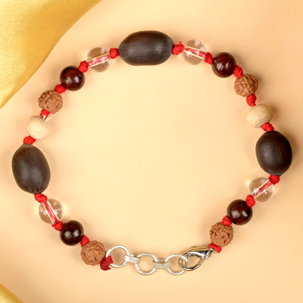 The Panch Bhoota Bracelet brings together five sacred natural elements-Lotus seed, Tulsi, Sphatik, 5 Mukhi Rudraksha, and Red Sandalwood, each tied with a vibrant red thread and finished with a metal clasp. The combination of deep brown lotus beads, clear Sphatik crystals, earthy Rudraksha beads, warm Tulsi, and smooth Red Sandalwood creates a balanced and harmonious design that feels grounded and spiritually uplifting.