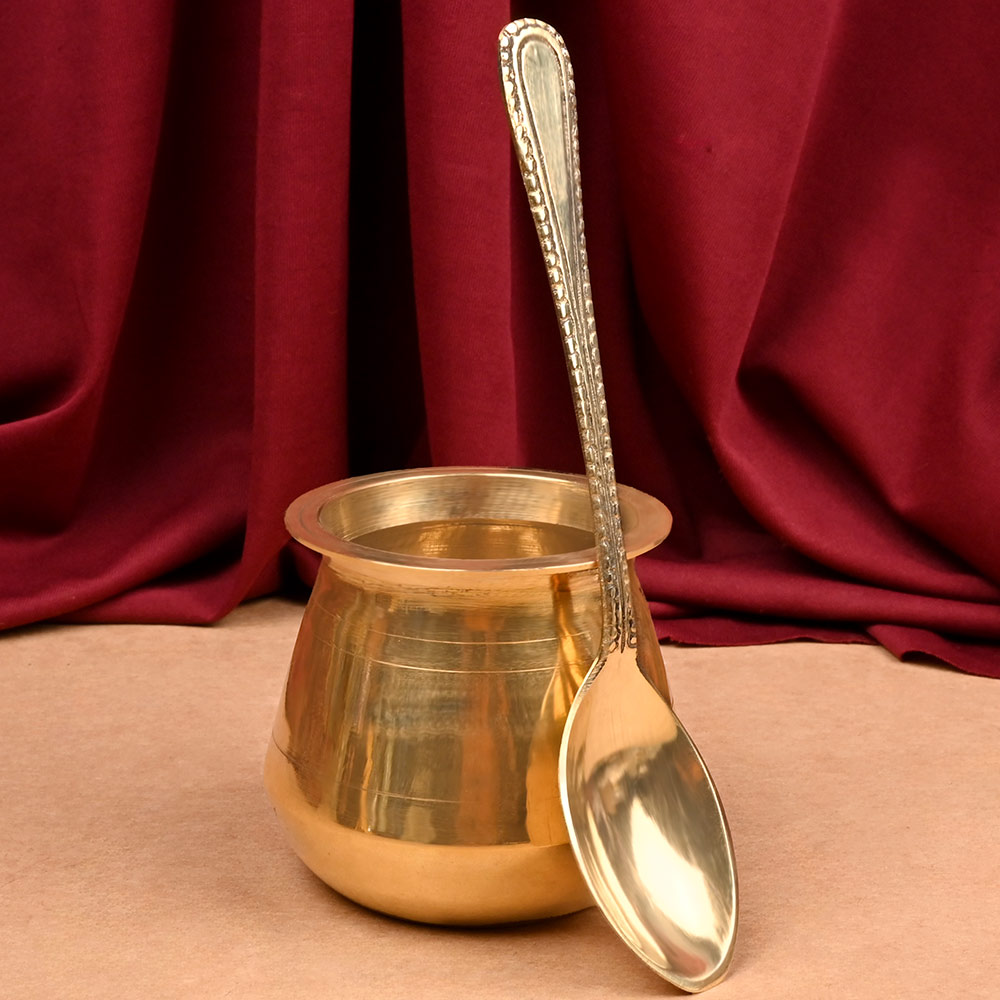 This Panchpatra and pali set (charan amrit set) is an integral part of poojas where in the holy charan amrit is placed before the pooja and then distributed upon the Pooja's completion. The Charanamrit literally means Amrit (Holy Nectar) from the Charan (Feet of the Lord) of the worshipped Deity and is partaken as a sacred offering or a holy gift after the completion of the Pooja.
